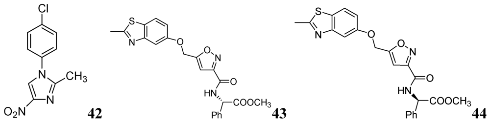 N-Aryl-C-nitroazoles were investigated by Walczak et al. against H37Rv (ATCC 27294) using the MABA assay. Compound 42 exhibited an MIC of 0.39 μg/mL [80]. A series of 2-methylbenzothiazole derivatives was described by Huang et al. Compounds 43 and 44 were found to be potent inhibitors of replicating Mtb H37Rv (MIC 1.4 and 1.9 μM, respectively) [81] (Figure 13).