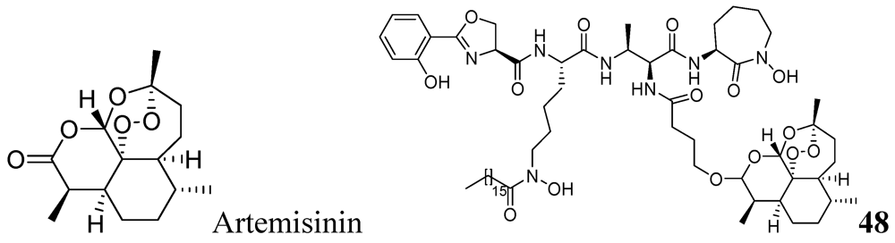 - Miller, M.J.; Walz, A.J.; Zhu, H.; Wu, C.; Moraski, G.; Mcollmann, U.; Tristani, E.M.; Crumbliss, A.L.; Ferdig, M.T.; Checkley, L.; et al. Design, synthesis, and study of a mycobactin-artemisinin conjugat that has selective and potent activity against tuberculosis and malaria. J. Am. Chem. Soc. 2011, 133, 2076–2079. [Google Scholar]