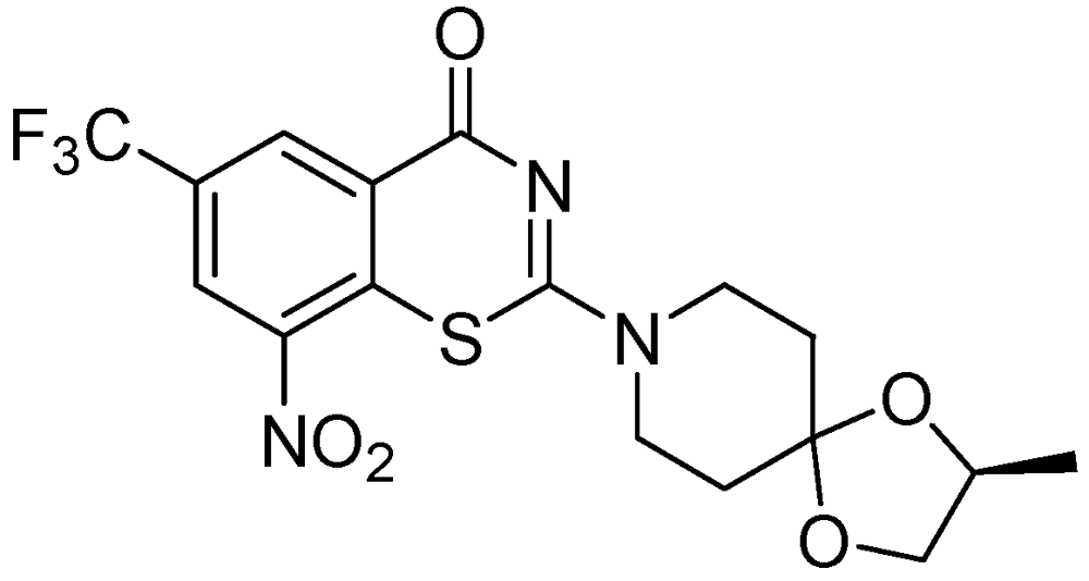 - Kawasaki, M.; Yamamoto, K.; Matusmoto, M. Mechanism of action of OPC-67683 against Mycobacterium tuberculosis [abstract F-1463]. In Program and abstracts of the 45th Interscience Conference on Antimicrobial Agents and Chemotherapy (Washington, DC); American Society for Microbiology: Washington, DC, USA, 2005. [Google Scholar]