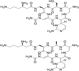 | Capreomycin (1963) MIC 1.25–2.5 μg/mL [ 36,37] | ![]() | 15–30 mg/kg (1 g) IM or IV | Auditory, vestibular, and renal toxicity | Inhibits protein synthesis (binds to ribosomal subunit 16S and 23S rRNA) [38] |