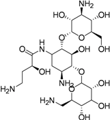| Amikacin (1972) MIC 4–8 μg/mL [39] | ![]() | 15–30 mg/kg (1 g) IM or IV | Same as capreomycin | Inhibits protein synthesis (binds to the bacterial 30S ribosome) |