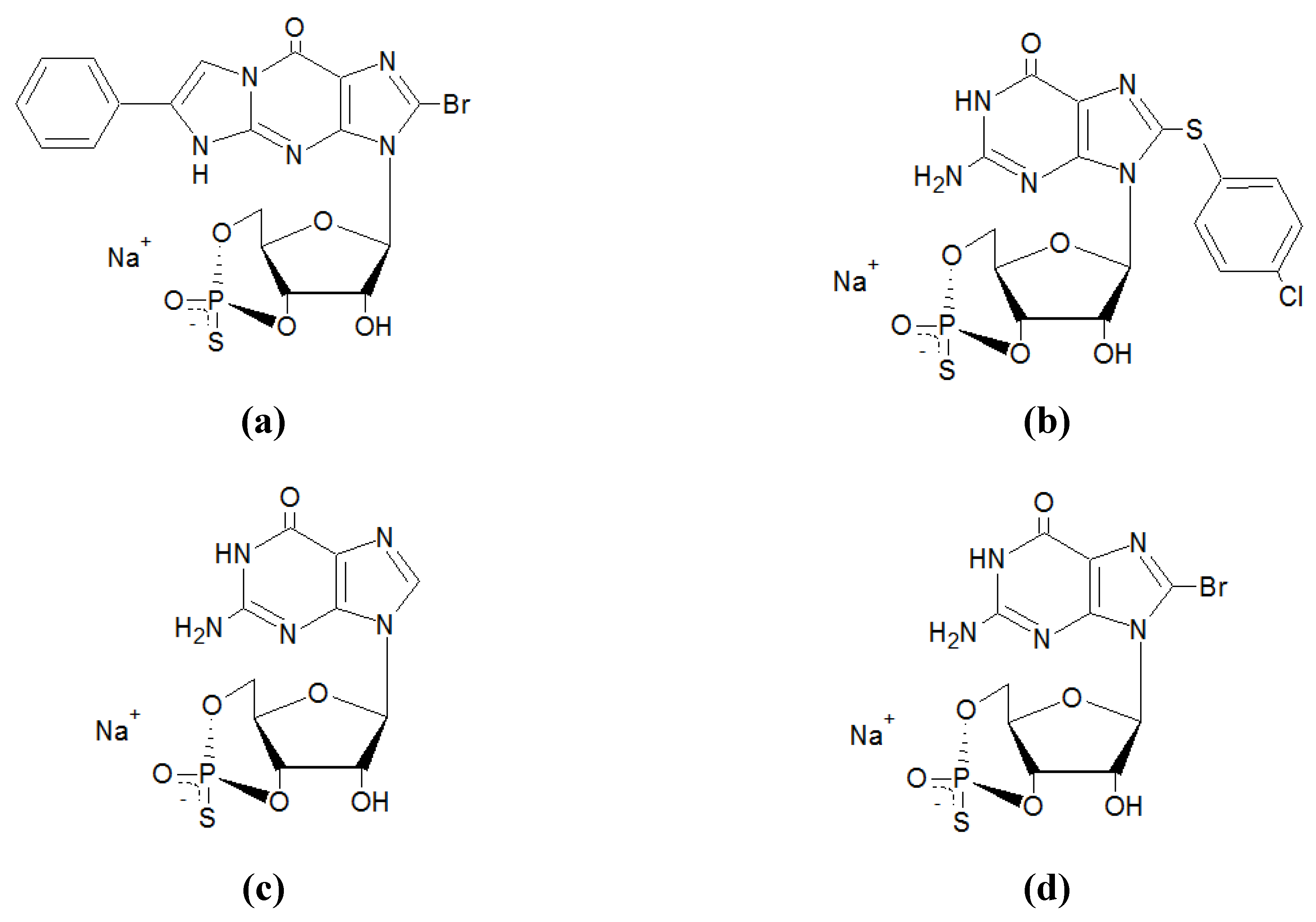 Chemical structures and names of cyclic nucleotide analogs. (a) (Rp)-8-Br-PET-cGMP-S, β-phenyl-1,N2-etheno-8-bromoguanosine-3',5'-cyclic monophosphorothioate (Rp- Isomer). (b) (Rp)-8-pCPT-cGMP-S, 8-(4-chlorophenylthio)guanosine-3',5'-cyclic monophosphorothioate (Rp- Isomer). (c) (Rp)-cGMP-S, Guanosine-3',5'-cyclic mono-phosphorothioate (Rp- Isomer). (d) (Rp)-8-Br-cGMP-S, 8-bromoguanosine-3',5'-cyclic monophosphorothioate (Rp- Isomer).