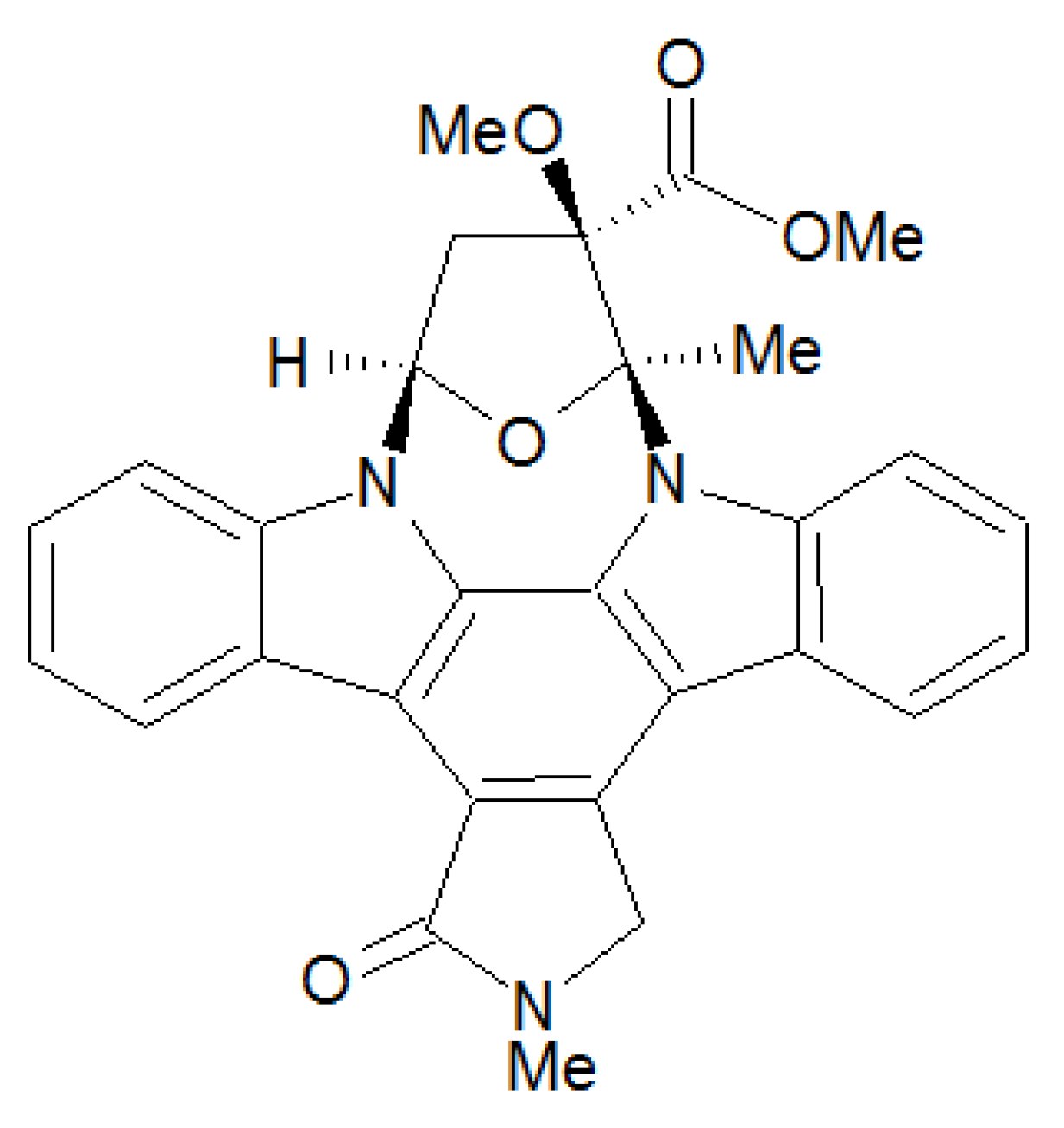 KT5823 is a potent, in vitro inhibitor of PKG, based on the structure of staurosporine (Figure 2). The substance inactivates the ATP-binding site by competition with ATP [23]. KT5823 is an indol carbazole with good membrane permeability. It is also a weak inhibitor of PKC (protein kinase C) and PKA [23,28]. The in vivo applicability is not ensured as in cells the inhibitory effect is very low/ cannot be detected [23].