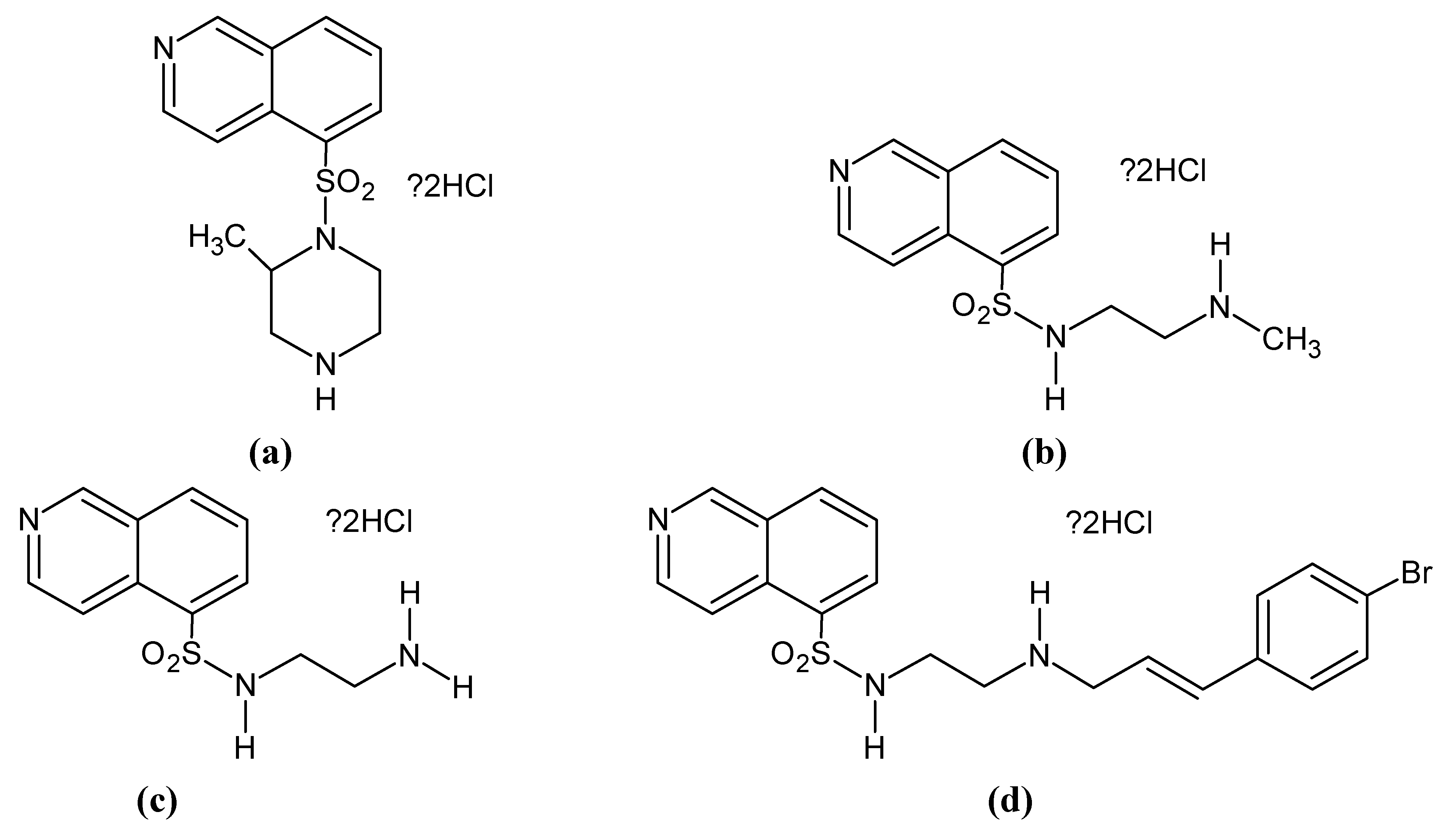 Chemical structures and names of the H-Series inhibitors. (a) H-7 hydrochloride, 1-(5-isoquinolinesulfonyl)-2-methylpiperazine·2HCl; (b) H-8 hydrochloride, N-[2-(methylamino)ethyl]-5-isoquinolinesulfonamide·2HCl; (c) H-9 hydrochloride, N-(2-aminoethyl)-5-isoquinolinesulfonamide; (d) H-89, N-[2-(p-bromocinnamylamino)ethyl]-5-isoquinolinesulfonamide·2HCl.