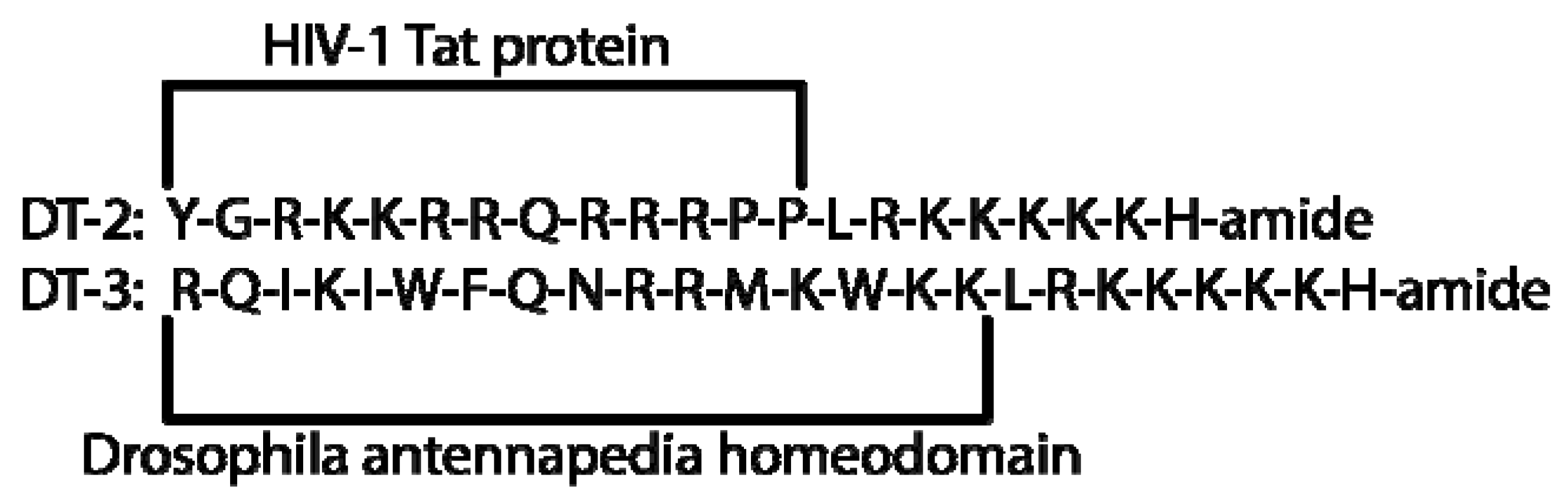 The highly potent DT inhibitor peptides are an improvement of the W-Series inhibitors. These substrate competitive fused-oligopeptides are targeted against the substrate domain and all are membrane-permeant. They do not constrict ATP binding. Via a N-terminal fusion of W45 to the membrane translocation sequences from HIV-1 Tat protein or from Drosophila antennapedia homeodomain the fusion peptide DT-2 or DT-3 are formed, respectively (Figure 5) [30]. DT-2 shows a high selectivity for PKG with a ratio of about 1300 fold compared to PKA [30]. Both PKG and PKA can be inhibited by DT-3, but it is 20000 fold more selective for PKG [30]. The inhibitory constants are shown in Table 1. DT-2 and DT-3 are used for in vitro studies; the in vivo use is controversial [31,32]. Uptake of DT-2 into cells occurs via endocytic or non-endocytic mechanisms depending on their cellular phenotype [33]. (D)-DT-2 is the D-amino acid analogue of DT-2 and can be used as a potent PKG-Iα inhibitor [34]. This peptide is proteolytically stable and the specificity index (PKG/PKA) can be almost compared to DT-3 with a ratio of approximately 15000 fold [34]. The applicability for in vitro studies is ensured; the in vivo use is not fully examined yet and depends on the biosystem used [34].