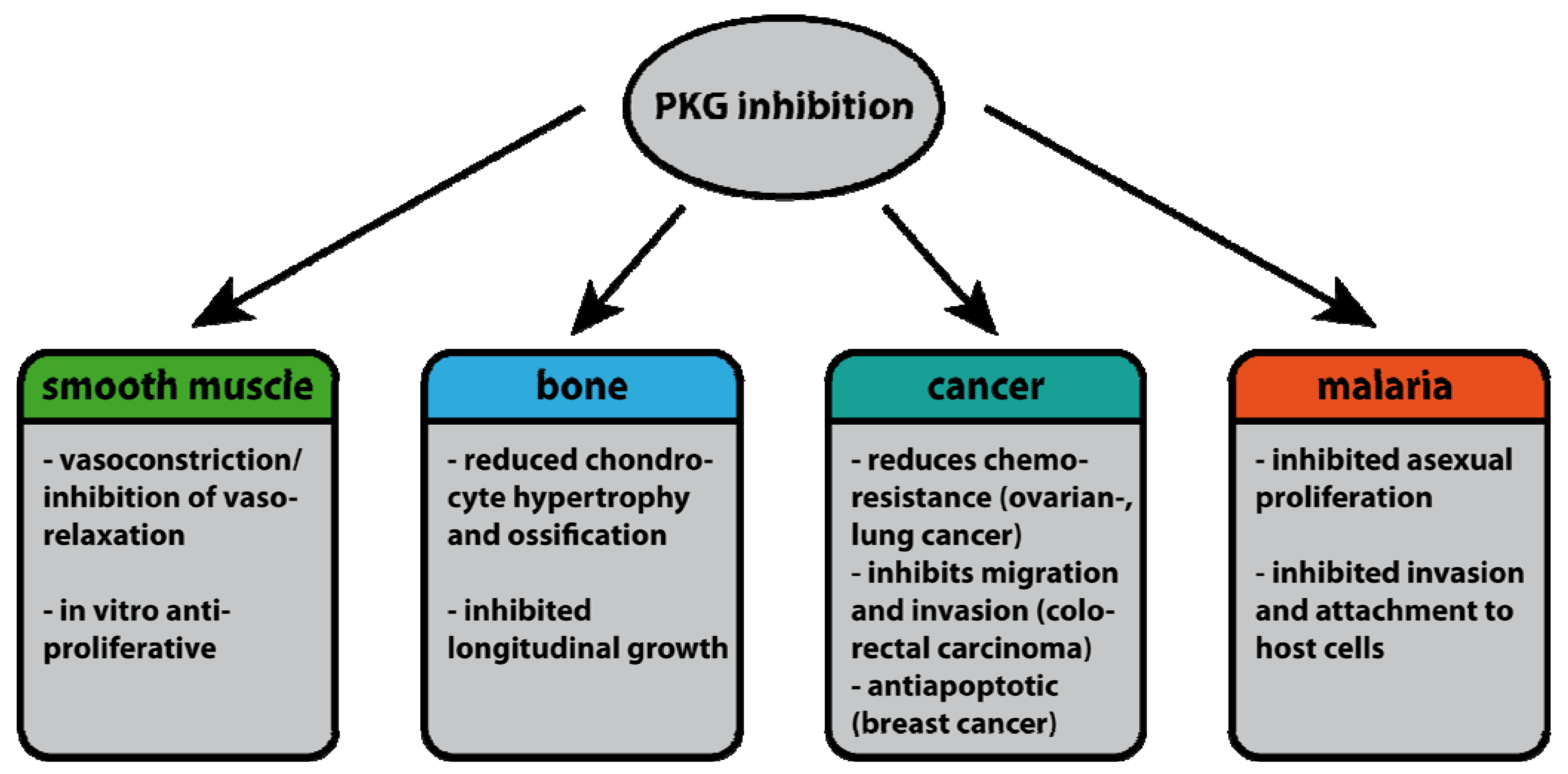 In this review the different available PKG inhibitors were summarized and the effect of PKG inhibition in various organ systems was presented. Current inhibitors of PKG activity target the ATP-binding, the cGMP-binding or the substrate recognition site. Some of these inhibitors (e.g., of the W-Series or DT-series) are highly specific compared to its inhibition of PKA. Diverse inhibitors can be used for analytical aspects in vitro. However, the application of these inhibitors in vivo is still tempting. Hence, there is a further need for the development of more specific and in vivo usable inhibitors to enhance its applicability in vitro and in vivo. The different physiological functions of PKG imply that its inhibition will yield in various pleiotropic effects (Figure 8). PKG-I inhibition in smooth muscle organs reduces vasorelaxation, influences vascular angiogenesis and retards intestinal motility. PKG-II inhibition in the intestine prevents toxin-induced diarrhea. PKG-II is also involved in bone development. In various cancer cells PKG inhibition suppresses proliferation and might influence apoptosis. PfPKG inhibitors could be useful in the treatment of various stages of malaria. Therefore, studies of PKG inhibitors might lead to new directions regarding therapeutic applications. Furthermore, they might guide to explanations of side effects of cGMP-enhancing substances or possible PKG activators.