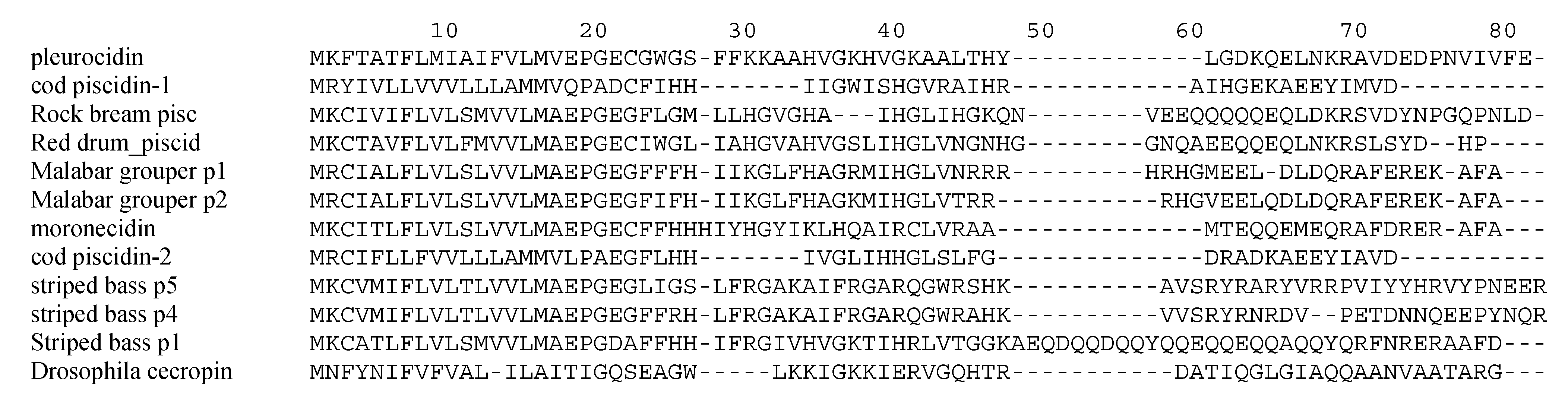 Alignment of piscidins. Mature peptide sequences were obtained from published data and from the PubMed protein database, and were aligned using MacVector software. The Drosophila cecropin A1 sequences is provided for comparison as a representative member of the cecropin family.