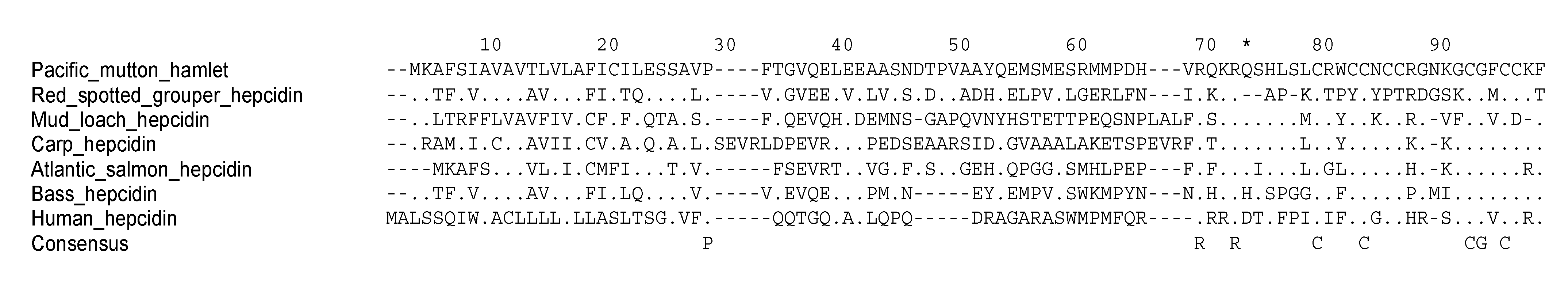 Alignment of hepcidins. Representative precursor peptide sequences were obtained from published data and from the PubMed protein database, and were aligned using MacVector software. Human hepcidin is shown for comparison. The first residue of the mature peptide region is denoted with an asterisk.