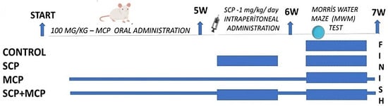 Group 2, scopolamine hydrobromide group (SCP): We followed the subjects for six weeks, and in the last week, we administrated 1 mg/kg scopolamine hydrobromide (Sigma, Taufkirchen, Germany), i.p., dissolved in 0.9% saline every day for seven days.
