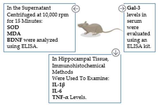 Following the behavioral tests, the rats were sacrificed under ketamine/xylazine anesthesia on the last day. The blood of the rats was taken intracardially while under anesthesia. Serum samples were separated after centrifugation at 4000 rpm for 12 min and stored at −80 °C for measurement of galectin level. After the brain tissue was homogenized at 10,000 rpm for 15 min, the supernatant obtained was stored at −80°C for analysis of the superoxide dismutase (SOD) activity, malondialdehyde (MDA), and brain-derived neurotrophic factor (BDNF) levels. The hippocampal tissue samples were fixed in formalin and subsequently analyzed through immunohistochemical staining to assess the levels of IL-1β, IL-6, and TNF-α. On the day of the study, the separated serum and sample were brought to room temperature and processed following the procedures of the relevant kits (Figure 2). MDA, an important indicator of lipid peroxidation; SOD, an important indicator of antioxidant defense; and BDNF, which plays a critical role in neurological recovery and repair, were preferred because they are important biomarkers; many studies have been conducted on them; and they are frequently evaluated in studies related to neurological diseases, especially Alzheimer’s.