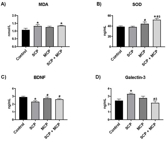 The hippocampal MDA level was significantly higher in the SCP and SCP+MCP groups than in the control group (p = 0.027, p = 0.017, respectively) (Figure 3A). Hippocampal SOD level was higher in the SCP+MCP group compared to all other groups (control, SCP, and MCP) (p < 0.001, p < 0.001, p = 0.02, respectively). Additionally, SOD was found to be higher in the MCP group compared to the SCP group (p = 0.049). In the SCP group, the hippocampal SOD level was lower than in the control group, although it was not significant (p > 0.05). (Figure 3B). BDNF was significantly lower in the SCP group compared to the control group (p = 0.001) and higher in the MCP and SCP+MCP groups compared to the SCP group (p = 0.005, p = 0.043, respectively) (Figure 3C). Plasma galectin-3 level was significantly higher in the SCP group compared to the control group (p = 0.007) and lower in the SCP+MCP group compared to the SCP and MCP groups (p < 0.001, p = 0.036, respectively) (Figure 3D).