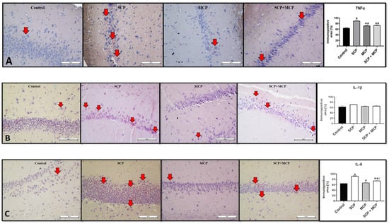 TNF-α immunoreactivity was significantly higher in all experimental groups (SCP, MCP, and SCP+MCP) compared to the control group (p < 0.001, p = 0.004, and p = 0.001, respectively). However, it was significantly lower in the MCP and SCP+MCP groups compared to the SCP group (p < 0.001 and p < 0.001, respectively) (Figure 4A). There was no significant difference between the groups regarding IL-1β immunoreactivity (p > 0.05) (Figure 4B).