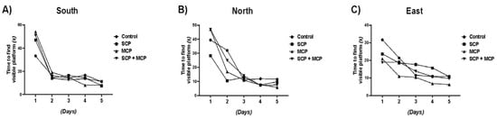 Morris water maze training days 1–5; Figures (A–C) show the results of the Morris water maze pretest conducted in the South (A), North (B), and East (C) regions. X-axis (days); Y-axis (time to find the platform); control (n = 6), scopolamine (SCP, n = 7), modified citrus pectin (MCP, n = 7), and SCP + MCP (n = 7) groups. During the MWM test (days 1–5), the time to find the platform gradually decreased in all directions (south, north, and east). Data are presented as mean values.