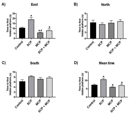 Morris water maze test results for directions East (A), north (B), south (C), and Probe Test mean time (D) in the control (n = 6), scopolamine (SCP, n = 7), modified citrus pectin (MCP, n = 7), and SCP+MCP (n = 7) groups. Data are presented as mean ± standard error of the mean (SEM). * p < 0.05 compared to the control group. # p < 0.05 compared to the SCP group.