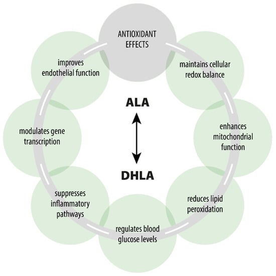 Alpha-lipoic acid (ALA or thioctic acid) has been extensively studied since its first isolation in 1951 [,]. ALA is an essential endogenous substance biosynthesized in mitochondria and exhibits an impressive range of pleiotropic biological effects that undoubtedly influence whole-body physiology [,,,,,,]. ALA’s specific mechanisms and effects across various pathological conditions are not fully clarified. Its antioxidant properties seem to underlie its beneficial health effects in managing various pathological conditions [,,,,,,,]. ALA and its metabolite dihydrolipoic acid (DHLA) are considered “universal antioxidants” and function as biological antioxidants, metal chelators, regenerators of other antioxidants, and modulators of several signaling pathways.