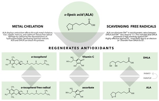 There is a vast body of literature on ALA/DHLA antioxidant effects [,,,,,]. ALA scavenges free reactive radicals, which can induce oxidative stress and contribute to various diseases, including diabetes, cardiovascular diseases (CVD), and neurodegenerative disorders [,,,,]. ALA serves as both a water-soluble and fat-soluble antioxidant, allowing it to function effectively in both aqueous and lipid environments, such as plasma membranes, cytosol, and mitochondria []. It also recycles other antioxidants, such as glutathione (GSH), and vitamins C and E, thereby enhancing their antioxidant capacities and repairing oxidative damage (Figure 2) [,,]. The presence of thiol groups in ALA accounts for its metal-chelating abilities []. The interactions of ALA with transition metals are particularly complex, as ALA’s ability to act as an effective scavenger often involves complex synergism with essential trace elements []. Moreover, it can increase the levels of GSH within the cells, which chelate and eliminate a wide range of toxins, particularly toxic metals [,].
