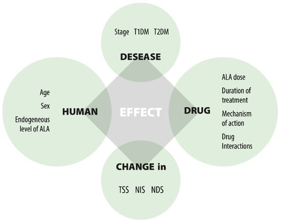 Numerous clinical trials have been carried out to assess the efficacy and safety of ALA in the treatment of DPN. A key confounding factor leading to inconsistent results is the variety of elements that affect clinical responses, as shown in Figure 3. The three main factors are: (1) the unresolved causes of DPN; (2) the multifunctional effects of ALA; and (3) the lack of precise markers to evaluate the drug’s efficacy in DPN treatment. This leads to challenges when comparing outcomes from different clinical studies. Despite differences in study designs and dosing, the significant findings from the trials include: (1) oral ALA at a dose of 600 mg/day effectively improves nerve conduction; (2) the effect is not dose-dependent beyond 600 mg/day; (3) oral ALA at 600 mg/day is equally effective as IV treatment; (4) oral ALA at 600 mg/day is well tolerated; (5) long-term use of oral ALA at 600 mg/day is safe; (6) there is inadequate evidence on the duration of treatment; (7) benefits do not persist after therapy ends; and (8) the clinical efficacy in severe DPN patients remains unverified.