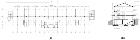 The transverse frame modelled and analysed in this study comes from an actual school building in Norcia (Italy, 42.7941° North latitude, 13.0963° East longitude). The building, which originally consisted of three aligned blocks, was later joined into a single complex during the various refurbishment works. The building consists of a reinforced concrete (RC) frame structure with a footprint of 12.80 × 59.80 m and a maximum height (from the foundations), corresponding to the roof beams, of about 16 m. The building consists of a one-floor basement, a ground floor, three storeys and an attic above ground. The inter-story height is 3.50 m for the basement floor and ground floor, 3.30 m for the other three floors, and 2.5 m for the attic (Figure 5). Built in 1962, the school has survived a variety of seismic events before the 6.5 magnitude central Italy earthquake that caused severe damage to structural and especially non-structural parts in 2016. In accordance with the construction methods of the time of construction, the structure was designed using 2D models schematizing the reinforced concrete frames in the transverse direction of the building. Although the legislation of the time did not explicitly require it, the designer also took into account the seismic action by applying an acceleration of 0.07 g.