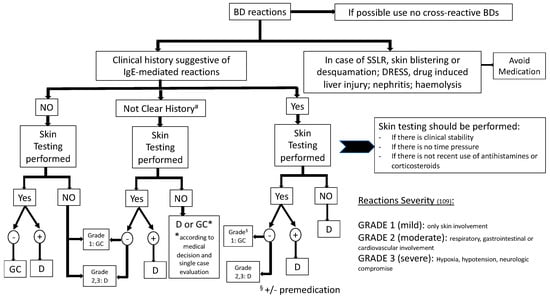 However, because skin testing with mAbs has unknown sensitivity, if skin testing results are negative, the choice of desensitization is based on the severity of the initial reaction. Premedication followed by standard infusion can be provided when initial reaction was mild and skin testing was negative. Desensitization is recommended when the initial reaction was moderate to severe. Figure 1 summarizes a proposal for investigation and management in case of reactions to BDs [,,,,,,,,,,,,,,,,,,].