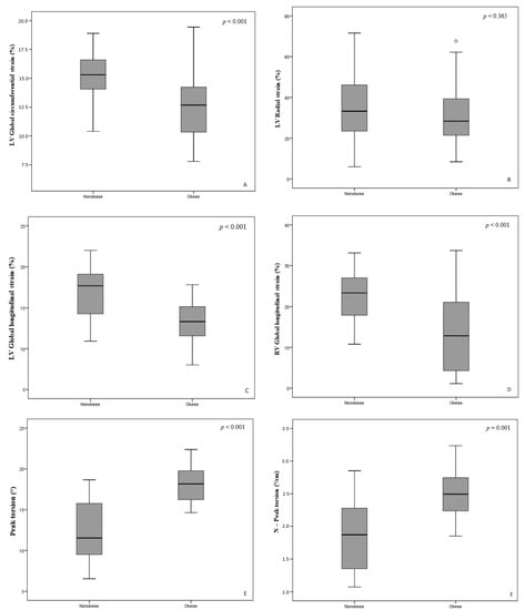 Assessing the systolic function of LV and RV by conventional echocardiography, the global LV ejection fraction (LVEF), tricuspid annulus motion amplitude did not differ between obese and nonobese children. Assessing the limitations of the conventional echocardiography measurement of LV and RV function [], age-dependent normal ranges of the 2D strain of the LV and RV were reviewed in healthy children, using 2D speckle tracking echocardiography technology [,,].