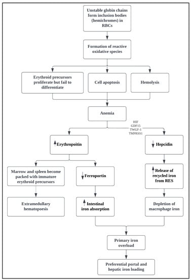 The sustained anemia and elevated erythropoietin levels stimulate erythroid precursors to release erythroferrone, which suppresses hepcidin expression, the main regulator of intestinal iron absorption in the body [,,]. The decrease in hepcidin levels increases ferroportin levels, which control iron absorption from the gastrointestinal tract and export intracellular iron into the circulation, particularly from the macrophages and hepatocytes [,]. Hepcidin can also be regulated by multiple factors, including growth differentiation factor (GDF)-15, hypoxia-inducible transcription factors, twisted gastrulation factor-1, and transmembrane protease serine 6 (TMPRSS6) [,,,]. Irrespective of the signaling mechanism, the results are suppressed hepcidin levels, increased iron absorption from the intestine, and the increased release of recycled iron from the reticuloendothelial system [,]. These will lead to a diminution of macrophage iron, preferential portal and hepatocyte iron loading, relatively lower serum ferritin levels, and free iron species in the circulation causing target organ damage [,,].