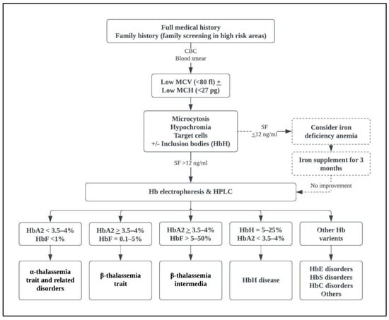 - Munkongdee, T.; Chen, P.; Winichagoon, P.; Fucharoen, S.; Paiboonsukwong, K. Update in Laboratory Diagnosis of Thalassemia. Front. Mol. Biosci. 2020, 7, 74. [Google Scholar] [CrossRef] [PubMed]