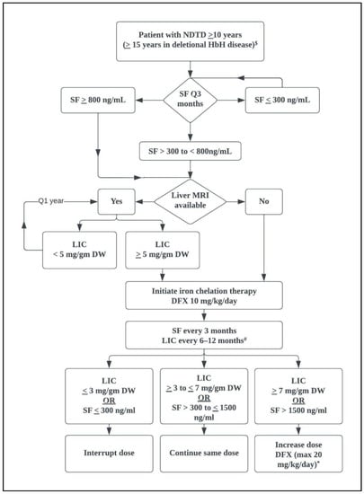 All patients with NTDT should be screened for iron overload starting at the age of 10 years when iron-related complications are anticipated to emerge []. The same procedures available for measuring iron overload in patients with TDT can be used in NTDT, with different cutoffs for intervention [,,]. Measuring serum ferritin levels is a simple and affordable testing method. However, it does not accurately reflect the degree of iron overload in NTDT, as it primarily reflects reticuloendothelial iron rather than hepatic iron storage [,,]. The guidelines for initiating chelation therapy in NTDT are lower than those for TDT []. The TIF recommends starting iron chelation in patients with NTDT aged ≥10 years if LIC is ≥5 mg Fe/g dry weight and discontinued when the level is <3 mg Fe/g dry weight []. If LIC measurement is inaccessible, iron chelation therapy should be initiated at ferritin level ≥800 ng/mL and interrupted at <300 ng/mL (Figure 3) [].