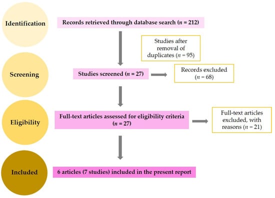 Following database electronic search, a total number of 212 reports were found—out of which, 117 were duplicate studies and were subsequently excluded. The remaining 95 articles were screened for titles and abstracts, and 68 were excluded for being either unrelated to the topic or lacking data for our interests. Next, 27 full-text studies were assessed, out of which 21 did not meet our inclusion criteria: 2 were reviews, and 19 did not offer sufficient statistical data. Finally, six articles, comprising seven different studies, were included in our meta-analysis [,,,,,].