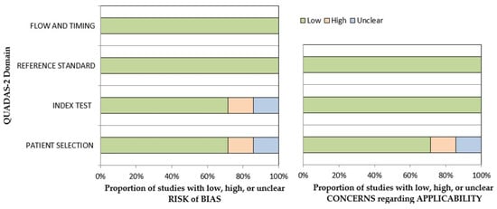QUADAS-2 was operated by two examiners in an independent fashion to reliably assess the quality of each included report [,,,,,]. This instrument includes four key domains (selection of patients, index test, reference standard, and flow and timing), all of which are assessed for risk of bias. For the applicability concerns testing, the first three areas were also used. A low risk of bias was taken into consideration if all the questions were answered with “yes”. The risk of bias occurred when one question was answered with “no”. The “?” (unclear) field was applied only for insufficient or poorly reported data to allow for proper judgment. The applicability concerns areas did not encompass these signaling questions but were categorized as “high”, “low”, or “unclear”.