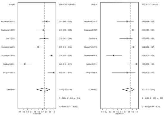 Sensitivity- and specificity-based forest plots in differentiating PCa patients from healthy/benign subjects. These plots display diagnostic probabilities with 95% CIs. Pooled estimates for specificity and sensitivity values are depicted as rhombus symbols [,,,,,].