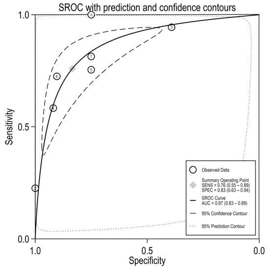 SROC curve for miR-375 in differentiating PCa from healthy/benign (with 95% CI and 95% prediction region). Circles represent estimates for each individual report (1 = Porzycki, 2 = Haldrup, 3 = Stuopelyte (1), 4 = Stuopelyte (2), 5 = Gao, 6 = Ciszkowicz, 7 = Kachakova).
