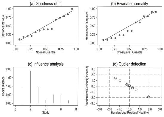 Both goodness-of-fit and bivariate normality analysis (Figure 5a,b) indicated the robustness of the calculation of the pooled estimates by the random-effects bivariate model, and no outliers were identified by influence analysis or in the outlier detection plot. (Figure 5c,d).