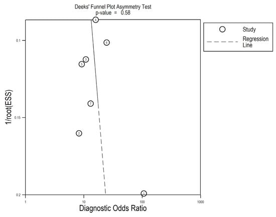 Lastly, we performed the pooled sensitivity and specificity analyses after the individual removal of each report, and we discovered that the final results did not differ to a great extent relative to the initial results. Correlated with the lack of significance in the Deeks’ asymmetry test (p = 0.58, Figure 7), these data highly suggest a lack of significant publication bias across reports and underline the stability and credibility of the results.