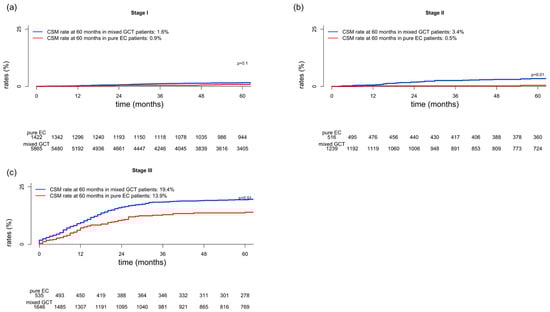 Cumulative incidence plots depicting cancer-specific mortality (CSM) in patients with pure embryonal carcinoma (EC) and mixed germ cell tumor (GCT) according to stage (a) I, (b) II, and (c) III.