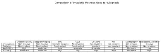 When considering imagistic methods for diagnosis, clinicians usually try to opt for the most painless, noninvasive, and non-radiant methods. Thus, the most commonly used method is ultrasonography, which is quick and readily available and can be done as many times as needed in order to determine a diagnosis [,]. Doppler imaging is another method in which the clinician can determine the blood flow surrounding the organ, which can help to determine the characteristics of the formation. Other classical methods include EUS, CEUS, CT scans, and MRI. Elastography is another noninvasive method in which one can map the characteristics of the tumor, such as the stage of fibrosis, which can lead to a diagnosis; it is an emerging technique that shows a lot of promise for the future. Other methods can be used, such as fine needle aspiration; however, this is a much more invasive method. On the other hand, fine needle aspiration gives a more accurate description of the characteristics of the tumoral formation (malign or benign). These main findings are explained more concisely in Figure 2.