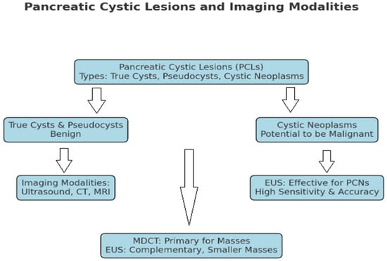 Nowadays, we can evaluate the type of pancreatic cysts (PLCs) present in pancreatic tissue []. PLCs can be classified as true cysts, pseudocysts, or cystic neoplasms. True cysts and pseudocysts are considered benign, while cystic neoplasms may turn malignant. They are further categorized into serous and mucinous cystic neoplasms, intraductal papillary mucinous neoplasms, and solid pseudopapillary neoplasms. The differentiation of these types is crucial due to their varying malignant potential.