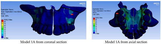 In general, more force was required in Group 1 models where pterygoid plates were not separated to expand the maxillary than in Group 2 models (Table 2). Accordingly, after maxillary expansion, more stress occurred in Group 1 models than in Group 2 models. (Figure 4 and Figure 5). The maxillary bone had less stress in Group 2 models than in Group 1 models (Table 5). The most stress occurred in Model 1A at 1142.20 MPa (in which a tooth-assisted appliance was used and pterygoid plates were not separated), while the least stress occurred in Model 2C at 368.34 MPa (in which a hybrid-assisted appliance was used and pterygoid plates were separated). In both group models, the highest stress occurred in the models using tooth-supported appliances, bone-supported appliances, and hybrid-supported appliances, respectively (Table 5).