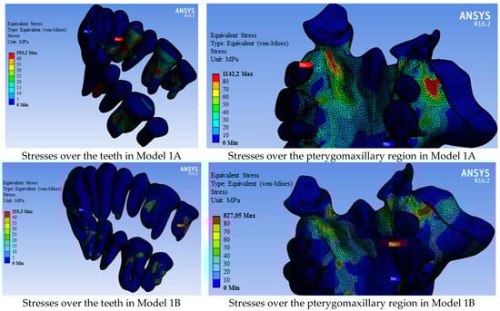 Von Mises stress values over the dental arc and pterygomaxillary region (MPa).
