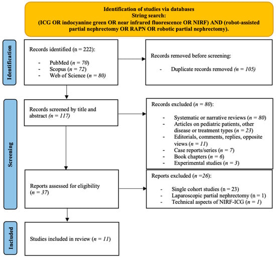 The PRISMA diagram presents the results of the literature research (Figure 1). We identified a total of 222 records; after excluding duplicates, 117 records remained for screening based on title and abstract. A total of 37 full-text manuscripts or meeting abstracts were then retrieved and assessed for eligibility, of which 23 single-cohort studies published as abstract or full-text articles, 1 original article only focusing on NIRF/ICG in patients treated with laparoscopic PN, and 1 study only describing technical aspects of NIRF/ICG technique were excluded. Therefore, a total of 11 records (10 full-text manuscripts and 1 conference abstract) published between 2012 and 2025 were included [,,,,,,,,,,].