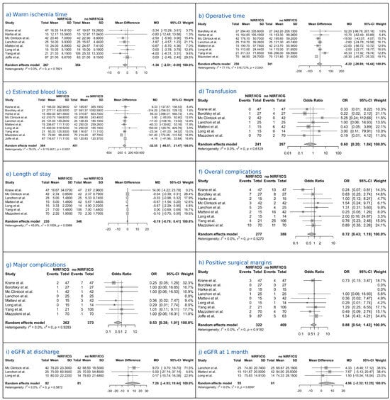 Three studies had a complete retrospective design without a matching adjustment. Mattevi et al. [] compared perioperative and functional outcomes of a cohort of 20 patients receiving NIRF/ICG-guided selective clamping RAPN with 42 patients receiving conventional RAPN with main artery clamping. Selective clamping was successful in 75% (n = 15) of NIRF/ICG cases. OT and EBL were similar between groups. No major complications were recorded in the NIRF/ICG-guided RAPN group, while three acute hemorrhages were recorded in the conventional RAPN group. Renal scan analysis showed significantly lower loss of operated kidney eGFR (5.5% vs. 21.5%, p = 0.046) and total eGFR (0% vs. 8%, p = 0.007) in the NIRF/ICG group. Yang et al. [] evaluated a series of 127 RAPN cases, including 21 performed with NIRF/ICG use. Compared to patients undergoing conventional RAPN, those undergoing NIRF/ICG-guided RAPN showed longer OT (311 vs. 271 min; p = 0.006) but superior eGFR preservation rate at 3-month follow-up (90 vs. 85%; p = 0.031). Joffe et al. [] examined a cohort of 150 patients undergoing both laparoscopic and robotic PN, 58% (n = 87) of whom underwent PN with NIRF/ICG. ICG use was not associated with differences in EBL, WIT, or PSM rates. In multivariable analysis, a tendency towards statistical significance was observed for ICG use and postoperative change in CKD stage (OR: 9.9, p = 0.05), with no impact on creatinine change or other perioperative outcomes.