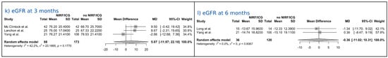 Three studies comprising a total of 163 patients reported complete data on eGFR at discharge. The random-effects analysis yielded an MD of 7.26 mL/min/1.73 m2 (95% CI: −4.93 to 19.44; p = 0.125), indicating no statistically significant difference between the NIRF/ICG-guided RAPN group and the control group. No heterogeneity was observed between the studies (I2 = 0%; Figure 2i). Three studies comprising a total of 136 patients reported complete data on eGFR at 1-month follow-up. The random-effects analysis yielded a pooled MD of 4.96 mL/min/1.73 m2 (95% CI: −2.32 to 12.25; p = 0.099), indicating no statistically significant difference between the NIRF/ICG-guided RAPN group and the control group. No heterogeneity was observed between the studies (I2 = 0%; Figure 2j). Three studies, comprising a total of 261 patients, reported complete data on eGFR at the 3-month follow-up. The random-effects analysis yielded a pooled MD of 5.07 mL/min/1.73 m2 (95% CI: −11.97 to 22.10; p = 0.329), indicating no statistically significant difference between the NIRF/ICG-guided RAPN group and the control group. Moderate heterogeneity was observed among studies (I2 = 42.2%; Figure 2k). Two studies, comprising a total of 156 patients, reported complete data on eGFR at the 6-month follow-up. The random-effects analysis yielded an MD of −0.36 mL/min/1.73 m2 (95% CI: −11.02 to 10.31; p = 0.745), indicating no statistically significant difference between the NIRF/ICG-guided RAPN group and the control group. No heterogeneity was observed among the studies (I2 = 0%; Figure 2l).