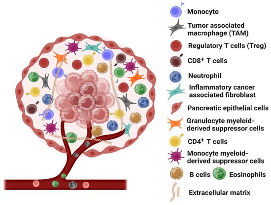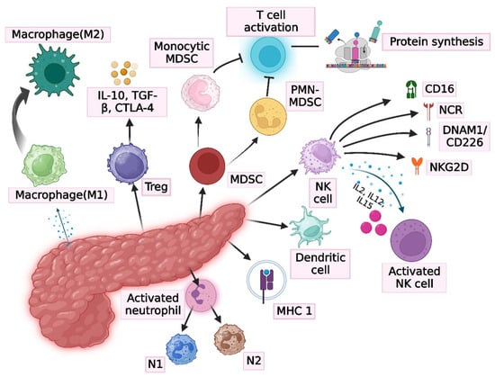 The immune system of PC primarily relies on the components of innate immune cells, including macrophages, myeloid cells, neutrophils, and T lymphocytes. Myeloid cells are present as MDSCs, which exist in two forms: polymorphonuclear MDSCs (PMN-MDSCs), phenotypically similar to neutrophils, and monocytic MDSCs (m-MDSCs), resembling monocytes (Figure 2) []. Their primary function is the suppression of the immune system through cysteine detachment mechanisms and the upregulation of arginase expression with concurrent downregulation of L-arginine, both essential for T-cell activation and T-cell protein synthesis, respectively []. Macrophages, in the form of TAMs, constitute another significant component of the immune system. The TME of PC induces primary macrophage M1 (pro-inflammatory) to differentiate into M2 (anti-inflammatory) subtypes. Tregs are abundant in the PC immune system and exert a suppressive role by secreting factors such as IL-10 and TGF-β and expressing CTLA-4 []. Typically, the immune environment of PC is characterized by reduced numbers of DCs, NK cells, and MHC class 1 molecules, which serve as the initial defense against cancer. The suppressive nature of the tumor results in a diminished presence of these cells []. NK cells, as innate immune cells, express CD56+ receptors and lack T-cell receptors. They are recognized for targeting virus-infected tumor cells. This anticancer activity of NK cells occurs independently of stimulation but it is facilitated by predominantly present receptors, such as CD16, NKG2D, DNAM1 (DNAX accessory molecule), and NK cell receptors []. NK cells can be activated by cytokines such as IL-2, IL-12, and IL-15 []. Furthermore, the tumor contains neutrophils, a type of granulocyte. PC can recruit neutrophil granulocytes into the solid tumor, but rather than eliciting an antitumor response, the neutrophils promote disease progression []. The neutrophil subtypes N1 and N2, referred to as tumor-associated neutrophils (TANs), are present in the early stages of PC and are known to regulate tumor development through various mechanisms, including proinflammatory cytokine release, angiogenesis, and invasion []. In a case study involving 112 patients with PDAC, 25 of whom were long-term survivors, the majority of components were identified as CAFs in a quiescent state. In addition, the long-term survivors exhibited increased levels of CD3+, CD4+, and iNOS+ cells (M1 macrophages and neutrophils) and a decrease in the expression of Tregs, CD68+ macrophages, and Foxp3 variants [].