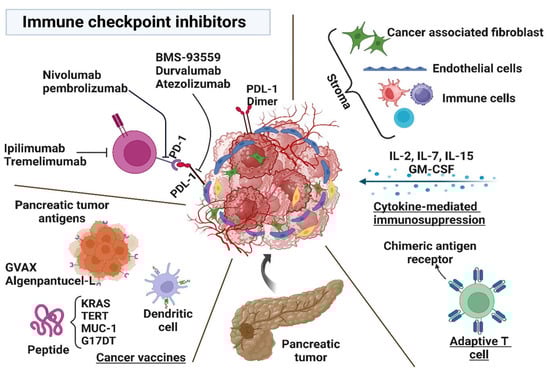 The effectiveness of immunotherapy in PC is limited by the relatively low number of aggregated mutations capable of inducing the expression of non-self-antigens, or “neoantigens,” which are recognized as foreign by the immune system. In comparison to malignancies with lower mutational loads, those with higher mutational burdens present a greater number of neoantigens, facilitating detection by the immune system [,]. There are three major limitations to immunotherapy for PC. Firstly, unlike lung cancer and melanoma, PC exhibits a very low mutational burden. Secondly, the immunosuppressive microenvironment, characterized by a dense desmoplastic reaction and a significant influx of tumorigenic macrophages and MDSCs, plays a significant role in the progression of pancreatic malignancy. Thirdly, the PC microenvironment is characterized by a paucity of infiltrating T cells, which hinders the development of adequate T-cell responses []. In addition to these factors limiting the efficacy of immunotherapy, other barriers to therapeutic success include the chronic inflammation associated with PC and the T-cell response to administered therapy []. When considering treatment with ICP blockade, only 4% of all tumor cells, including PC cells, CAFs, and CD163+ TAMs, express the PD-1 immune checkpoint [].