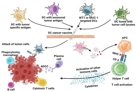 DCs as a cancer vaccine targeting PC cells. DCs can be loaded with tumor-specific antigens and exosomal antigens. In addition, the fusion of tumor cell lysates with DCs, as well as WT1- or MUC-1-targeted DCs, can be produced. Following the administration of the DC vaccine, the released tumor-specific antigens are presented in the bloodstream by APCs to helper T cells, thereby initiating cell-mediated immunity against pancreatic tumor cells. DCs directed against MUC-1 have the capability to bind directly to the MUC-1 receptors present on the tumor cells, thus eliciting an immune response.