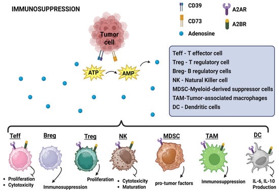 Immunosuppression. CD73 is expressed in various cell types within the TME and serves as a significant immunosuppressive agent by generating extracellular adenosine. Adenosine, through its interaction with A2AR and A2BR receptors on diverse immune cells, impairs the function of immune cells that defend against tumors (such as effector T cells, NK cells, DCs, and B cells), while enhancing the activity of immune cells that suppress the immune response (such as Treg cells, TAMs, MDSCs, and CAFs).