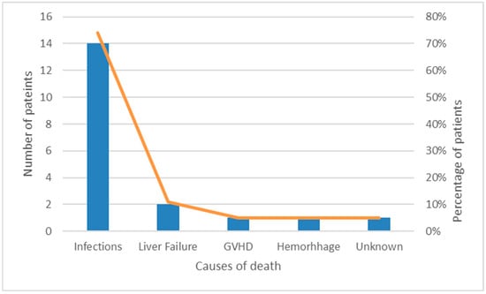 This figure presents the distribution of causes of death among non-relapsed patients, highlighting infections as the leading cause (14 patients, approximately 75%). Other causes, including liver failure (11%), GVHD (5%), and hemorrhage (5%), were less frequently observed.
