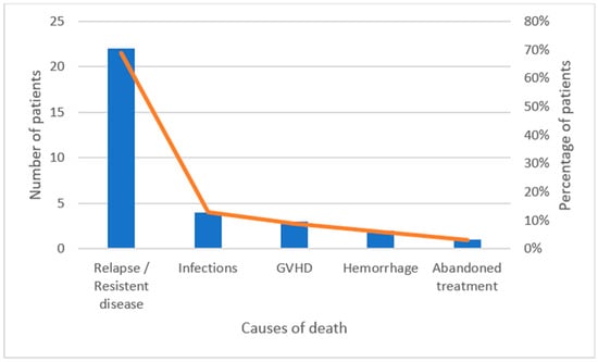 This figure illustrates the distribution of causes of death among relapsed patients, with relapse or resistant disease being the predominant cause (22 patients, approximately 70%). Other causes, such as infections, GVHD, hemorrhage, and abandoned treatment, account for progressively fewer deaths, representing 13%, 9%, 6%, and 3% of patients, respectively. Regarding infections, the most common isolated microorganisms were Pseudomonas aeruginosa (7 patients—5 non-relapsed and 2 relapsed), Aspergillus fumigatus (6 patients—5 non-relapsed and 1 relapsed), and Fusarium spp. (2 patients—1 non-relapsed and 1 relapsed).
