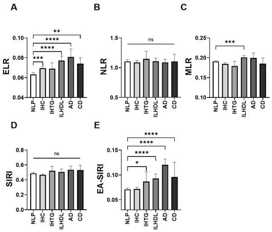 Comparison of leukocyte-derived inflammatory indices across dyslipidemia phenotypes. Bar plots depict the median levels of five leukocyte-based inflammatory markers, including (A) eosinophil-to-lymphocyte ratio (ELR), (B) neutrophil-to-lymphocyte ratio (NLR), (C) monocyte-to-lymphocyte ratio (MLR), (D) systemic inflammation response index (SIRI), and (E) eosinophil-adjusted systemic inflammation response index (EA-SIRI), across six lipid profile categories: normolipidemic profile (NLP), isolated hypercholesterolemia (IHC), isolated hypertriglyceridemia (IHTG), isolated low high-density lipoprotein cholesterol (ILHDL), atherogenic dyslipidemia (AD), and combined dyslipidemia (CD). ns, not significant; * p < 0.05; ** p < 0.01; *** p < 0.001; **** p < 0.0001.
