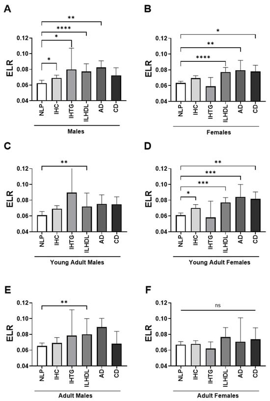 Age- and sex-stratified distribution of eosinophil-to-lymphocyte ratio (ELR) across dyslipidemia phenotypes. Bar plots depict the median levels of ELR across different dyslipidemia phenotypes, stratified by sex and age group. (A) Males (overall), (B) Females (overall), (C) Young adult males (<45 years), (D) Young adult females (<45 years), (E) Adult males (≥45 years), (F) Adult females (≥45 years). The six dyslipidemia phenotype groups are displayed from left to right in each plot as follows: normolipidemic profile (NLP), isolated hypercholesterolemia (IHC), isolated hypertriglyceridemia (IHTG), isolated low high-density lipoprotein cholesterol (ILHDL), atherogenic dyslipidemia (AD), and combined dyslipidemia (CD). ns, not significant; * p < 0.05; ** p < 0.01; *** p < 0.001; **** p < 0.0001.