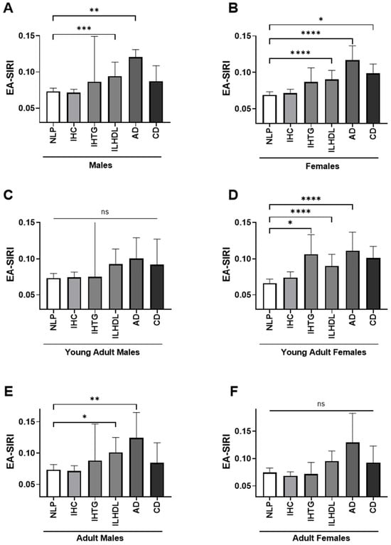 Age- and sex-stratified distribution of eosinophil-adjusted systemic inflammation response index (EA-SIRI) across dyslipidemia phenotypes. Bar plots depict the median levels of the EA-SIRI across different dyslipidemia phenotypes, stratified by sex and age group. (A) Males (overall), (B) Females (overall), (C) Young adult males (<45 years), (D) Young adult females (<45 years), (E) Adult males (≥45 years), (F) Adult females (≥45 years). The six dyslipidemia phenotype groups are displayed from left to right in each plot as follows: normolipidemic profile (NLP), isolated hypercholesterolemia (IHC), isolated hypertriglyceridemia (IHTG), isolated low high-density lipoprotein cholesterol (ILHDL), atherogenic dyslipidemia (AD), and combined dyslipidemia (CD). ns, not significant; * p < 0.05; ** p < 0.01; *** p < 0.001; **** p < 0.0001.